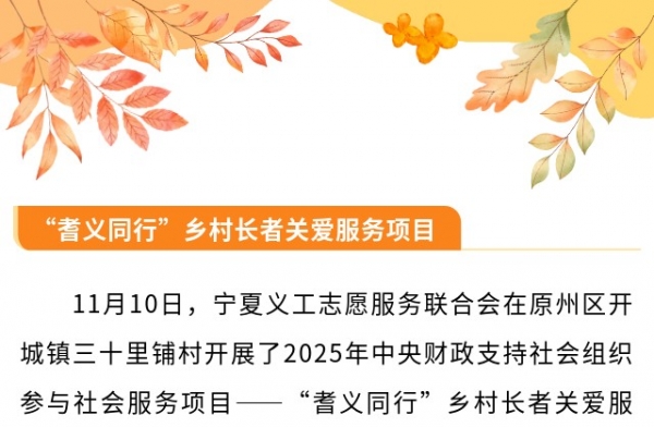 11月10日,宁夏义工志愿服务联合会在原州区开城镇三十里铺村开展了2025年中央财政支持社会组织参与社会服务项目——“耆义同行”乡村长者关爱服务项目“唱享欢乐·耆乐无穷”